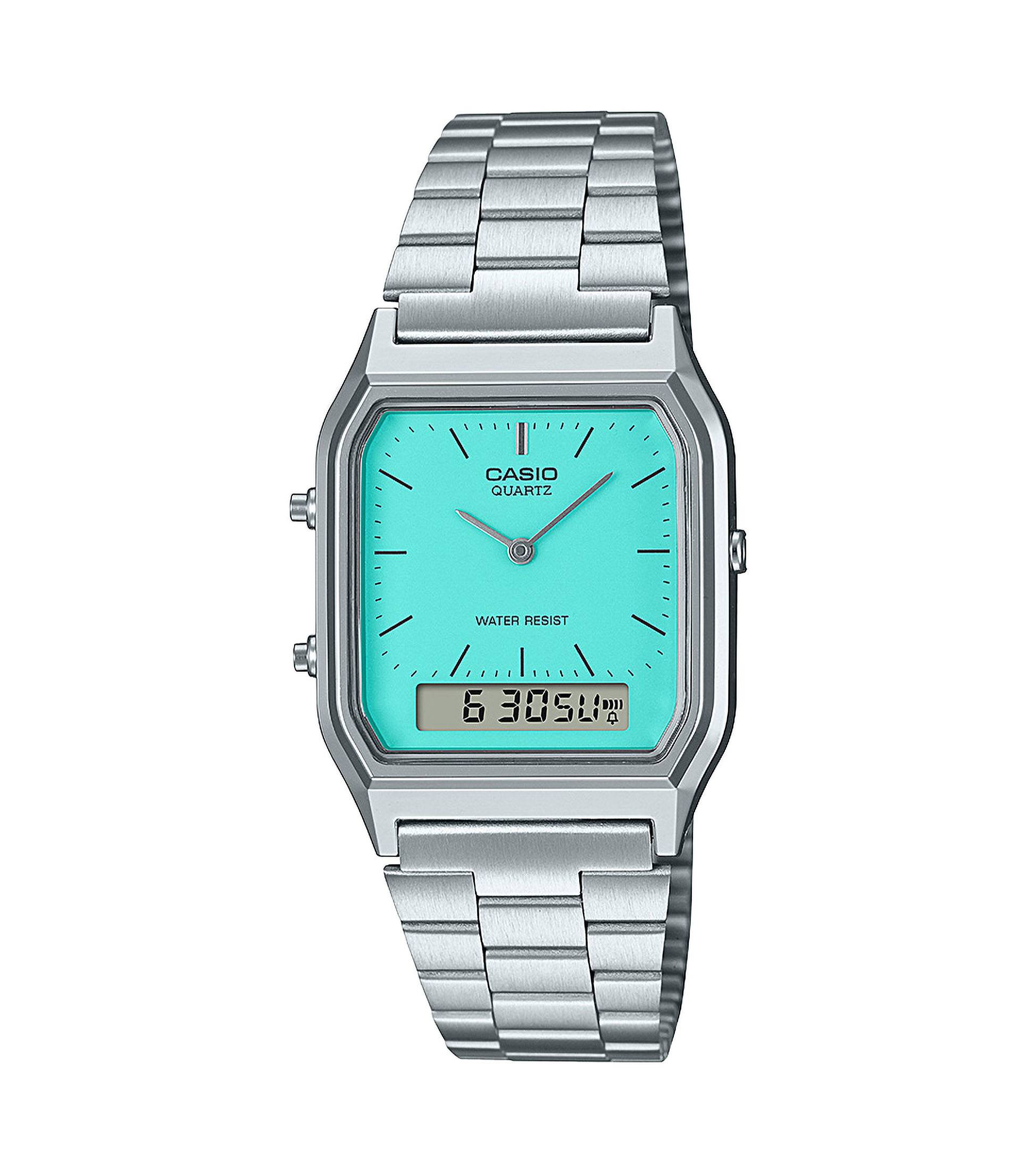 Elegantemente classico, ma con colori di tendenza.La cassa angolare racchiude un quadrante che sprigiona i colori delle ultime tendenze. La semplicità del design incontra la funzionalità moderna in un orologio analogico dotato di una piccola finestra digitale, in cui è possibile avere più informazioni a portata di mano. Un design versatile e raffinato perfetto per ogni occasione, dagli eventi più eleganti alle uscite più informali.Scegli tra tre incredibili colori: blu ghiaccio, turchese o argento.