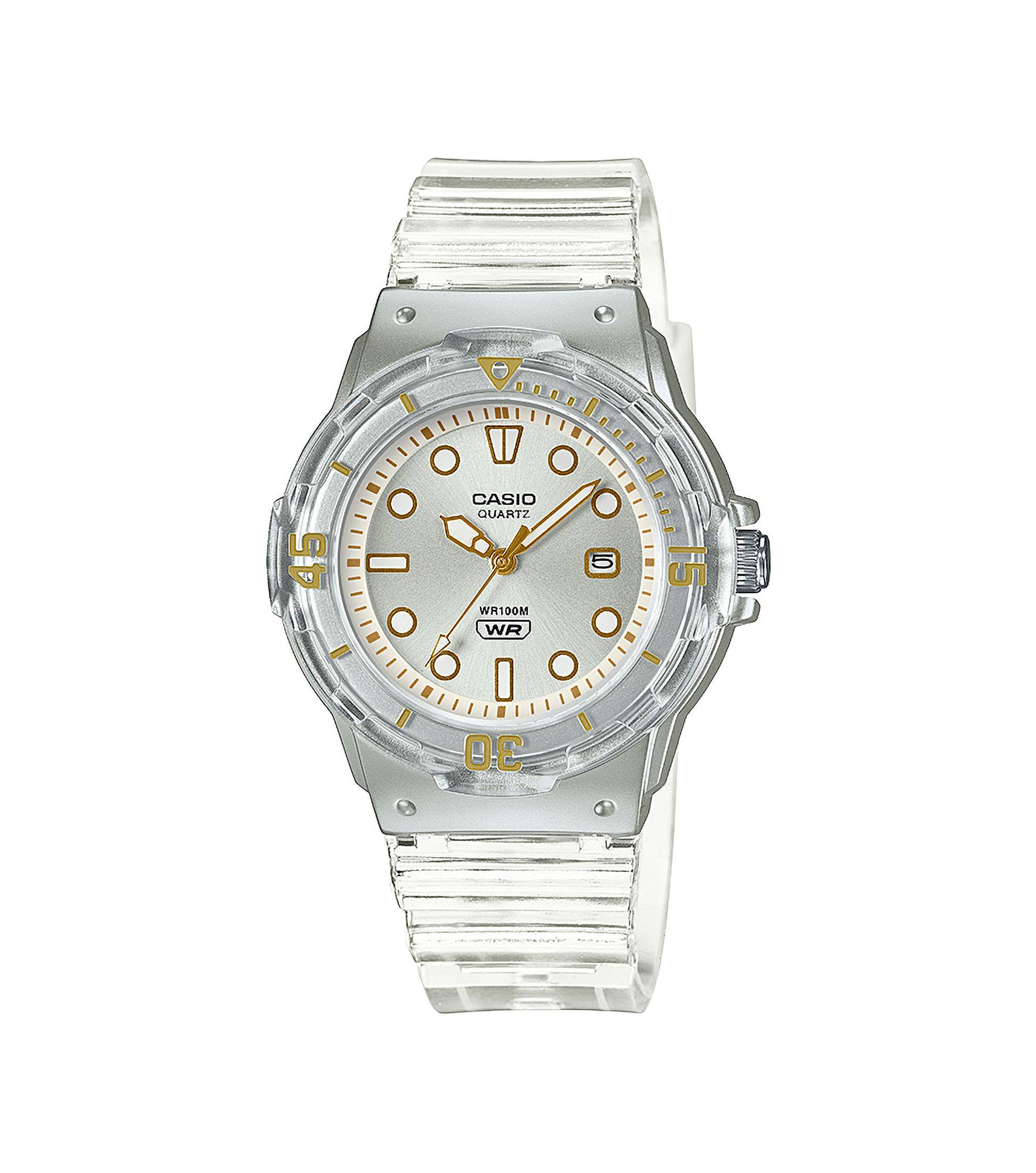 Immergeti nello splendore e nella lucentezza di un orologio analogico compatto con lunetta e cinturino traslucidi.Indicatori ispirati alla nautica e un quadrante che richiama i raggi del sole con una lucentezza metallica si fondono per dare vita a un design sofisticato ed elegante.