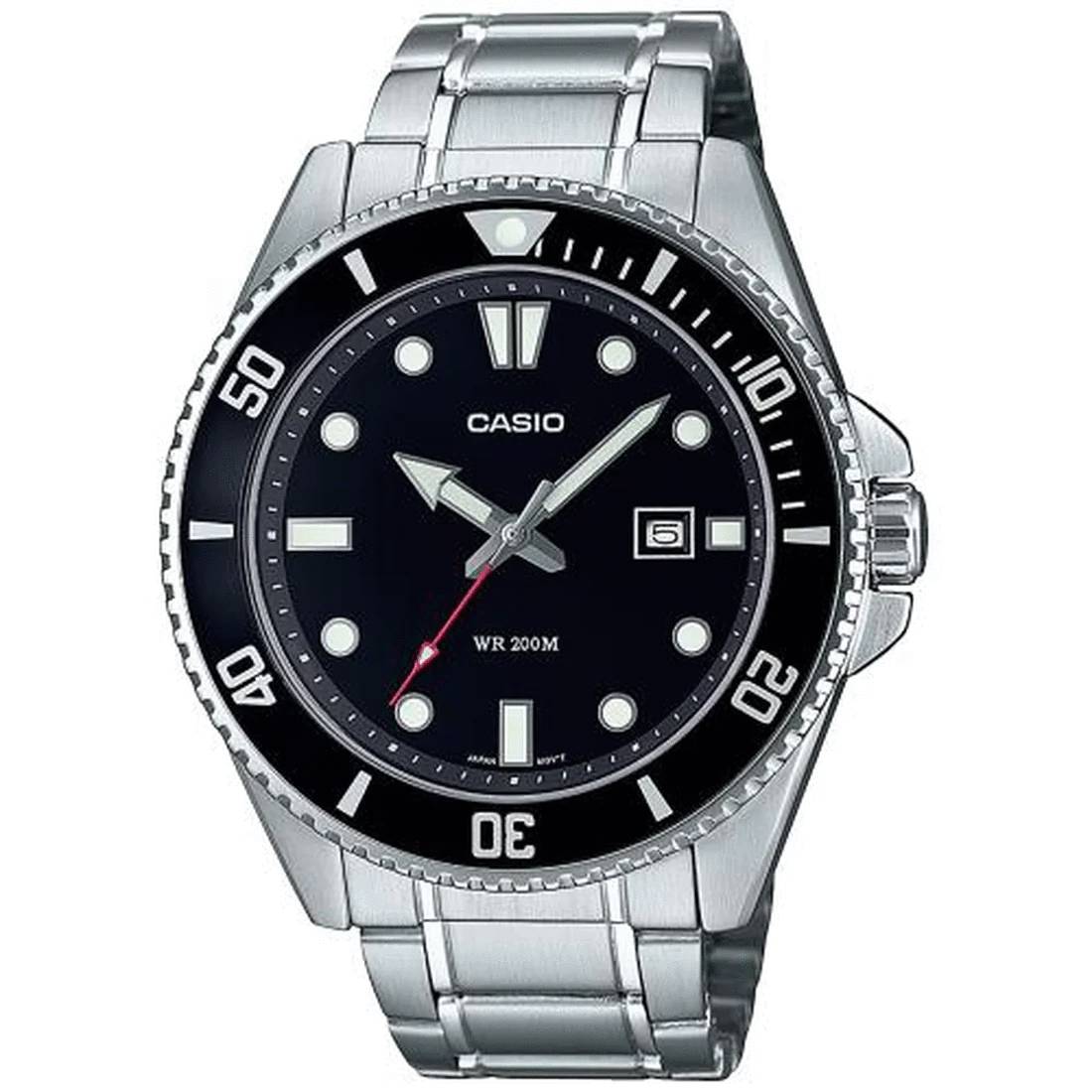 Casio da uomo MDV-107D-1A1VEF della linea Duro con quadrante e ghiera girevole nera, orologio subacqueo resistente fino a 200mt, cassa in acciaio da 44,2 mmBracciale in acciaio, movimento al quarzo, corona e fondello a vite e vetro minerale.Un modello comodo per essere indossato in ogni occasione per le sue linee semplici e pulite e per la sua classificazione di impermeabilità di 20 bar.