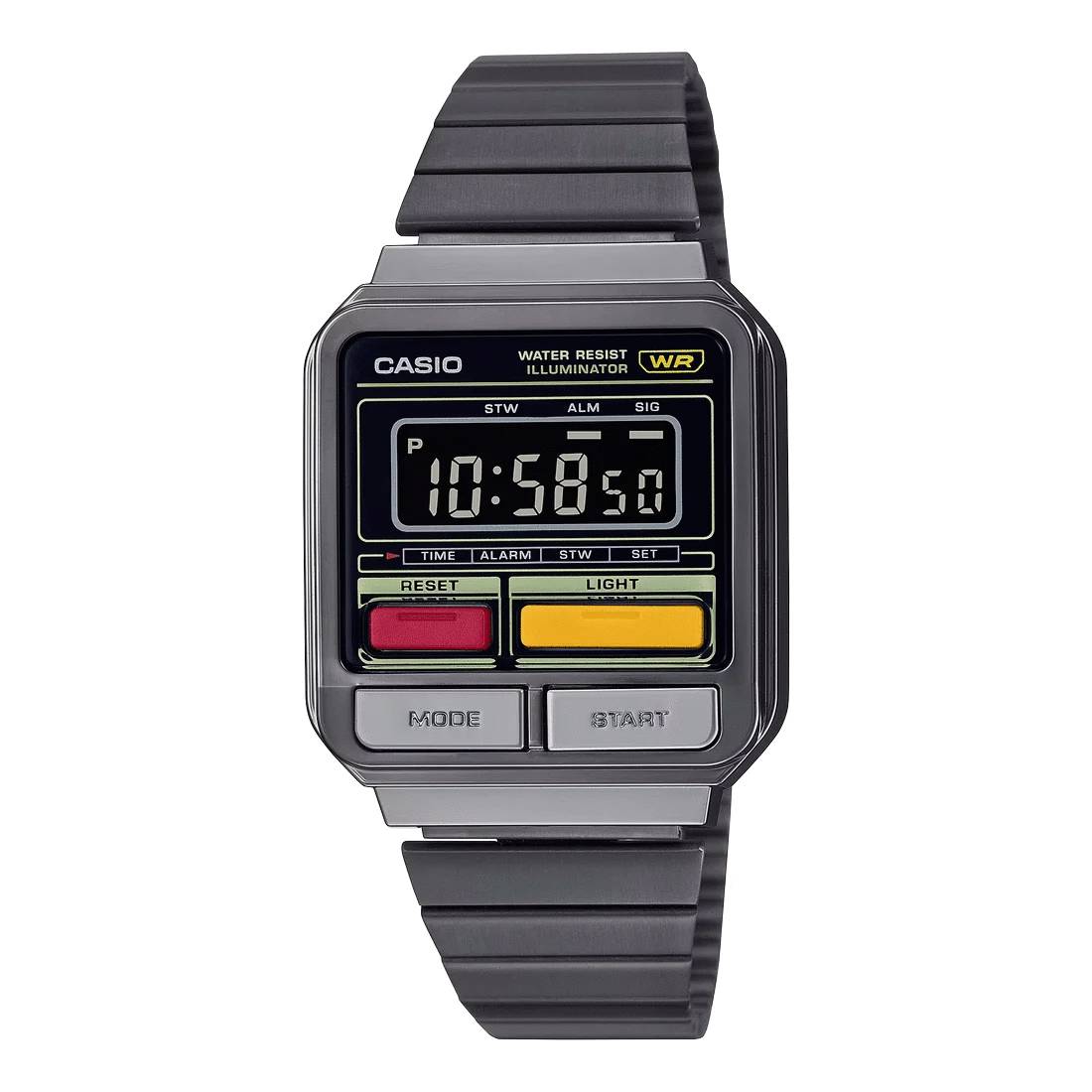 Orologio Casio Vintage A120WEGG-1BEF dal tipico design anni '80 con i pulsanti frontali colorati, cassa da 32,7mm in resina brunita nera e bracciale acciaio abbinato, display negativo. Perfetto sia da uomo che da donna. Cronografo, sveglia e calendario automatico lo rendono uno dei modelli di più facile utilizzo.