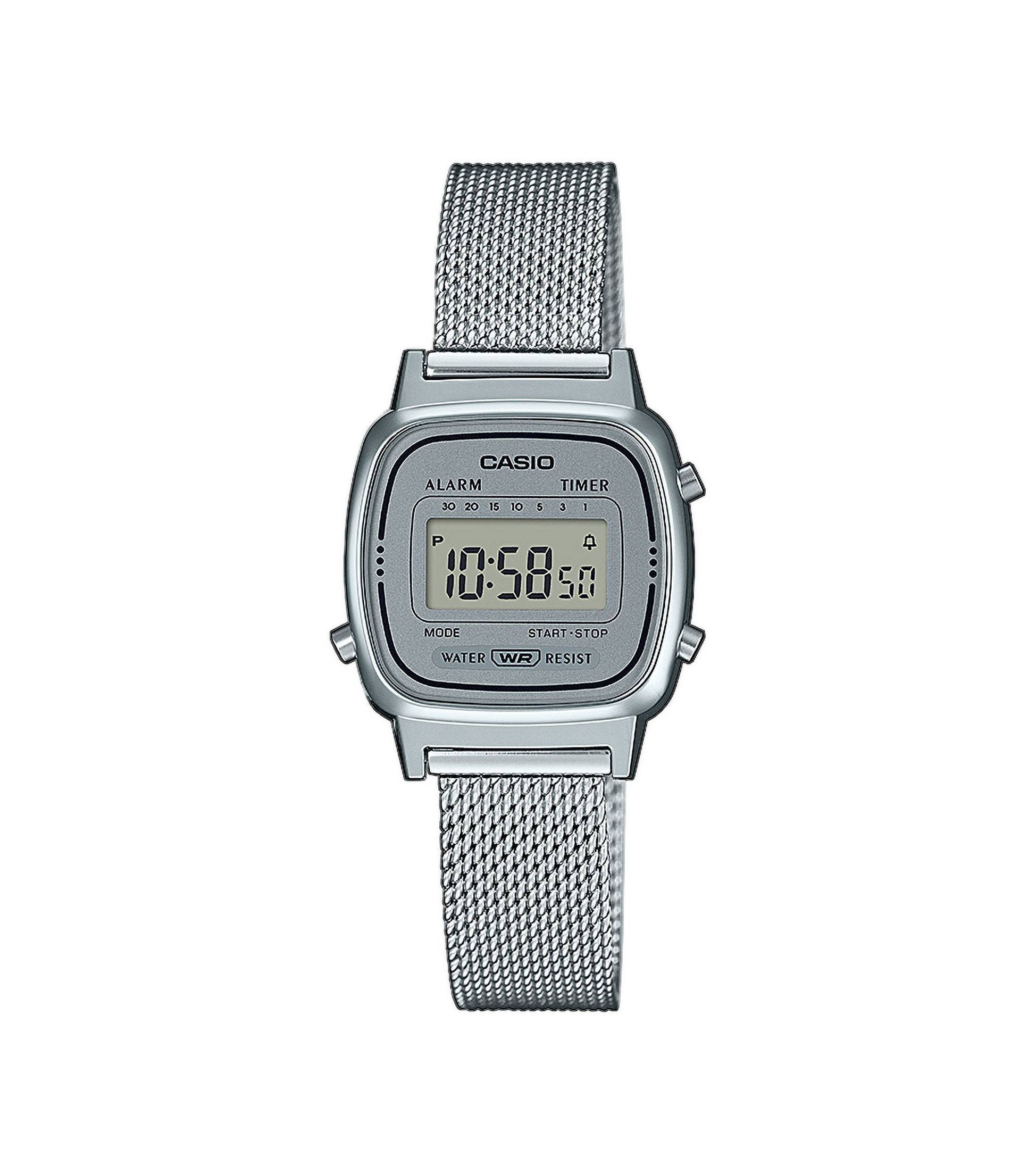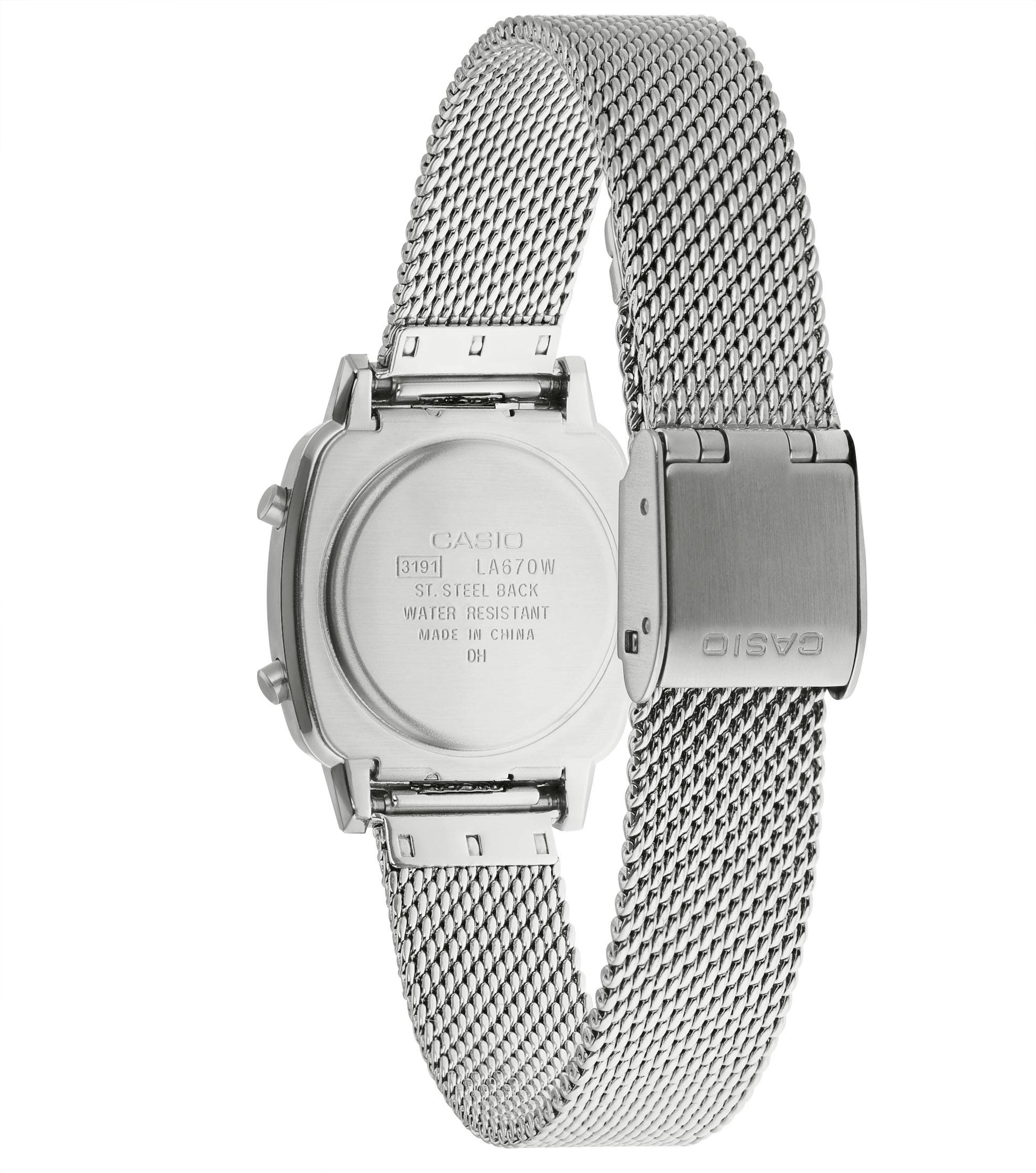 Dimensioni della cassa (A x L x P) 30.3 x 24.6 x 7.3 mm Peso 30 g Materiale della cassa e della lunetta Materiale cassa/lunetta: resina / cromato Cinturino Cinturino a maglie in acciaio inossidabile Chiusura regolabile Impermeabilità Impermeabile Alimentazione e durata della batteria Durata approssimativa della batteria: 2 anni con CR1216
