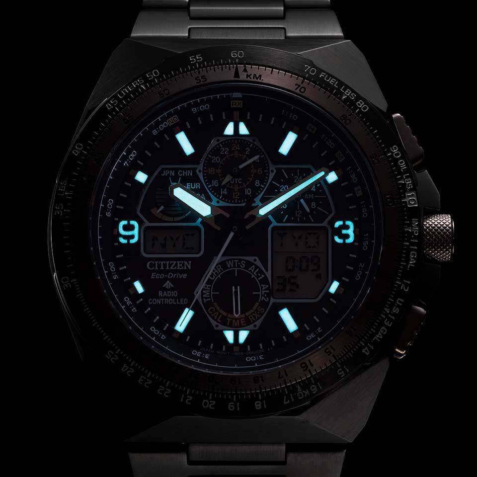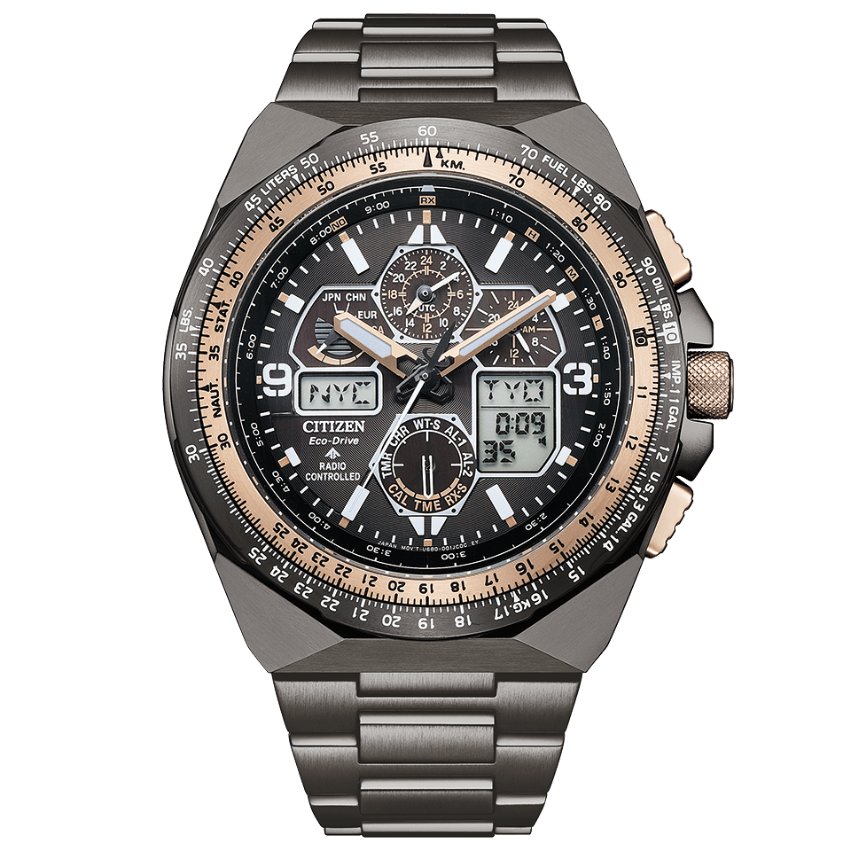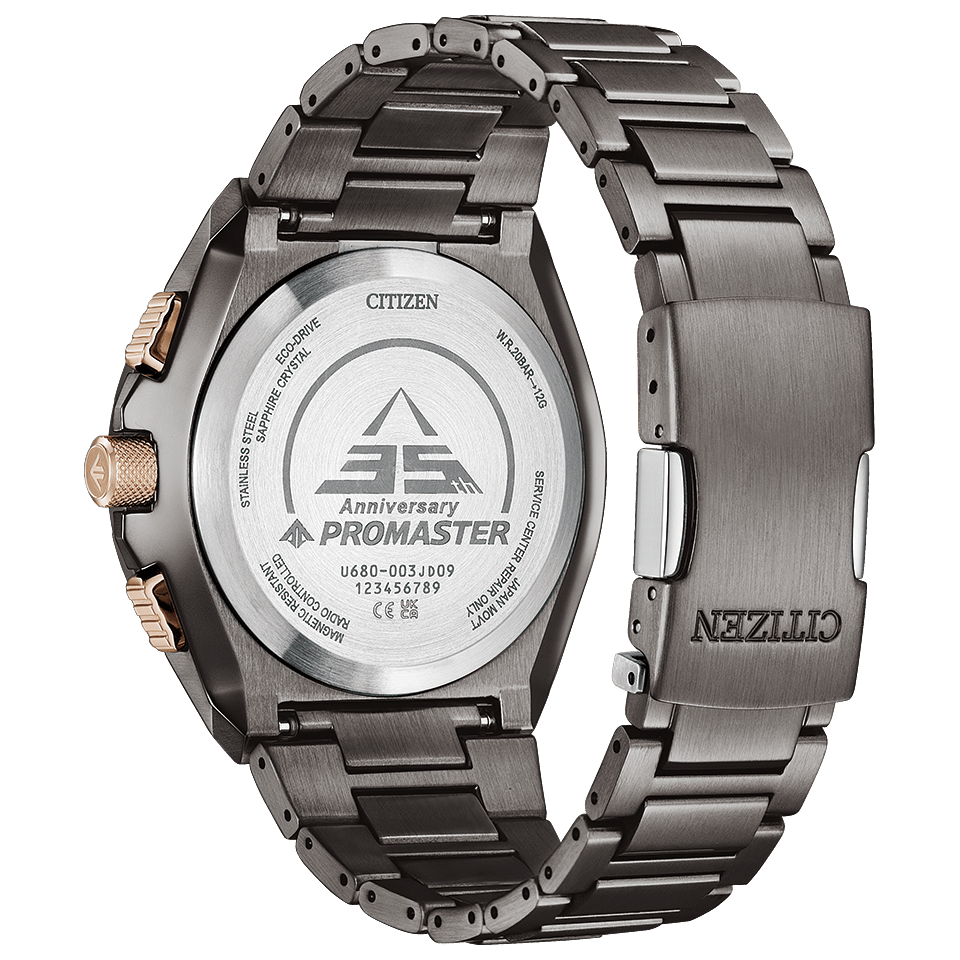 Orologio Citizen Promaster Air riferimento JY8146-54E.Limited Edition a 5600 orologi in tutto il mondo.Movimento Eco-Drive cal. U680 a carica di luce con riserva di carica fino a 3.5 anni. Resistenza magnetica di tipo 1.Cassa da 46 mm in acciaio IP grigio scuro con dettagli rosa Sakura per la lunetta, la corona e i pulsanti del cronografo. Vetro zaffiro antiriflesso.Quadrante nero con componenti analogici e display LCD ad alta risoluzione. Indici e lancette luminescenti.Fondo con incisione logo commemorativo del 35° anniversarioBracciale in acciaio IP grigio scuro con chiusura deployante con pulsanti. WR 20 AtmGaranzia ufficiale Citizen di 5 anni