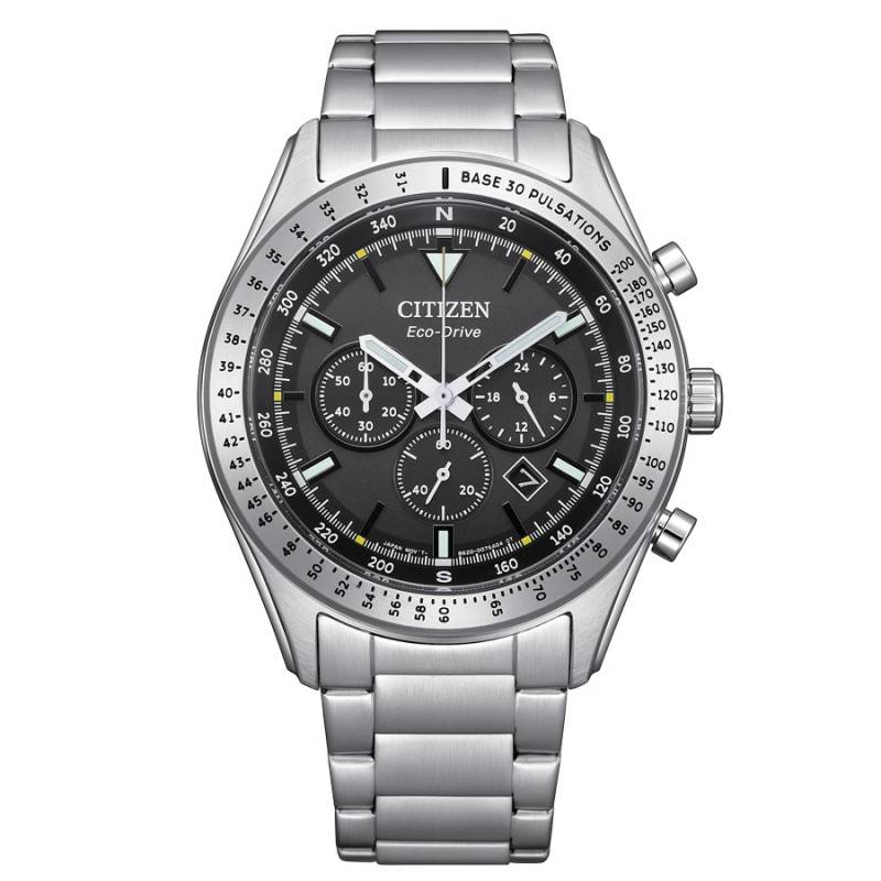 Orologio Citizen Chrono Outdoor Rescue, riferimento CA4600-89E. Movimento Eco Drive calibro B620 con riserva di carica di 270 giorni, cronografo e data. Cassa in acciaio da 43 mm, fondo serrato a vite. Vetro minerale. Quadrante nero, con indici e lancette luminescenti. Datario a ore 4/5. Bracciale in acciaio con chiusura di sicurezza a pulsante. WR 10 bar.