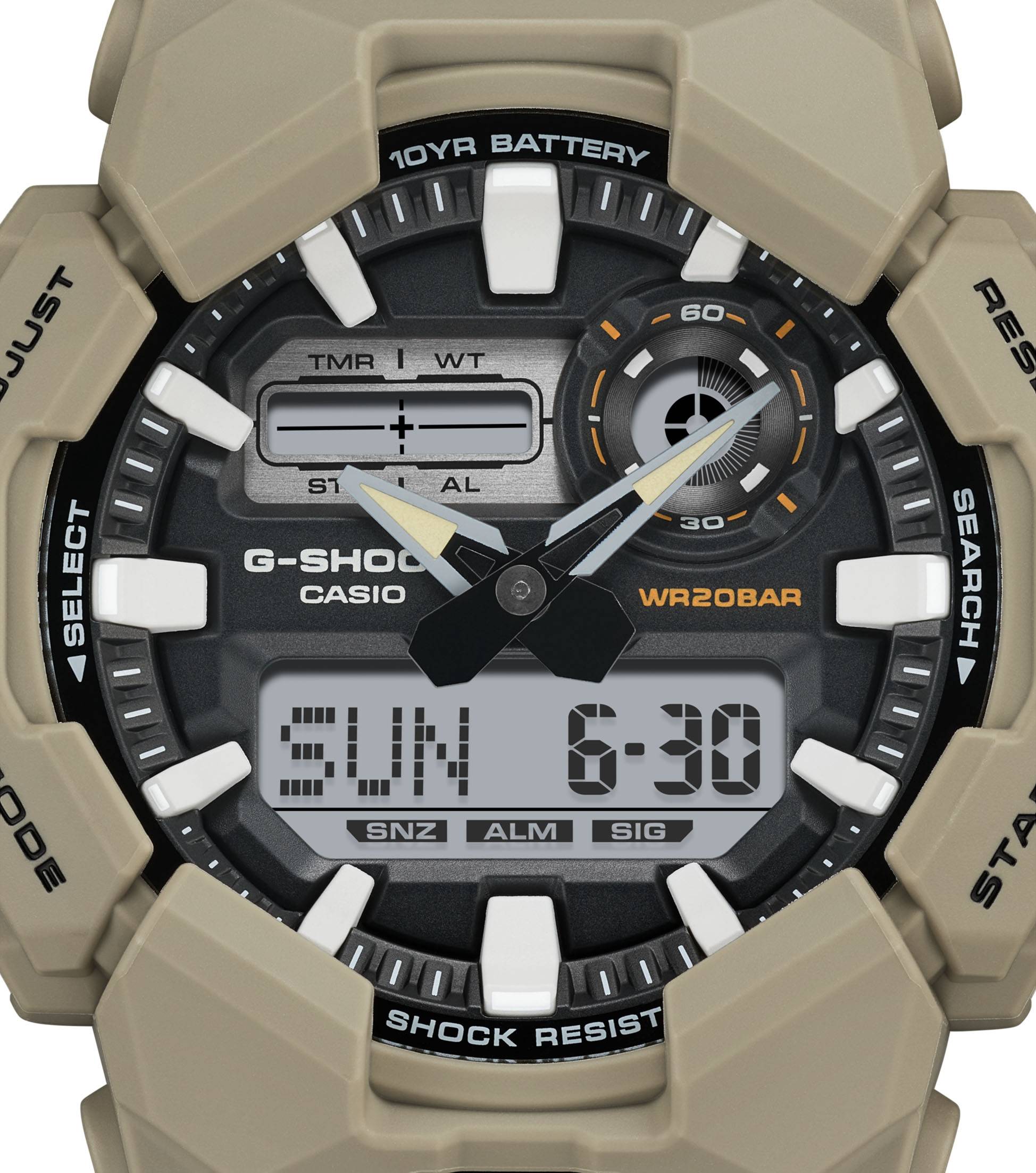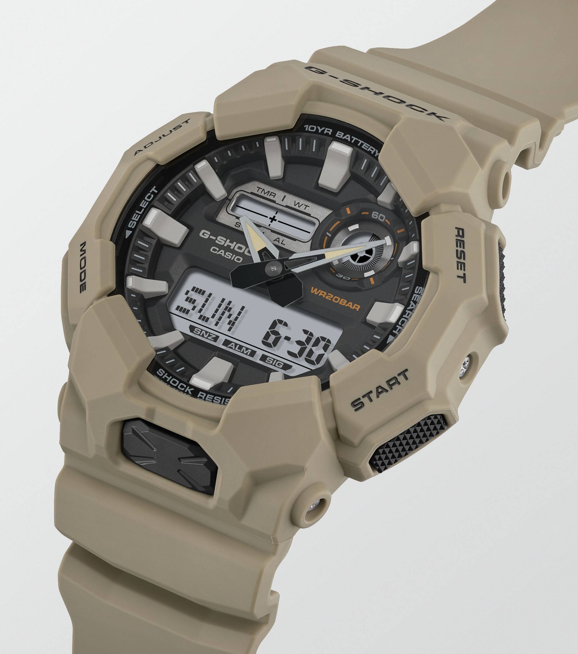 Meno cambi di batterie con un G-SHOCK con cassa grande e una batteria di 10 anni di cui non ci si dovrà più preoccupare per anni.Il modello GA-010 analogico-digitale offre pratiche funzioni come l'ora internazionale e il cronometro, nonché una luce LED ad alta luminosità, facilmente accessibile dall'ampio pulsante sulla parte anteriore della cassa, che garantisce visibilità anche al buio.Realizzato in resina a base biologica e dotato di una batteria di 10 anni, questo G-SHOCK è perfetto se si vuole ridurre l'impatto ambientale.Disponibile in una selezione di combinazioni di colori di stile a base nera per un design accattivante che passa con facilità da ambienti casual a situazioni di lavoro.