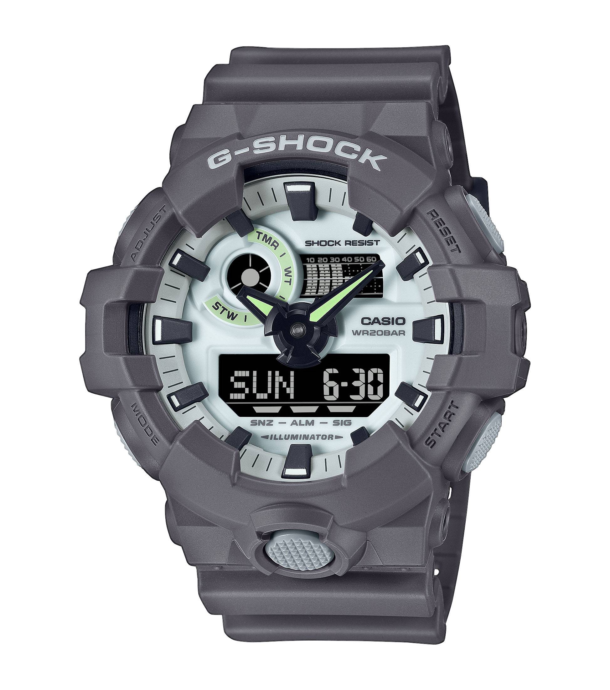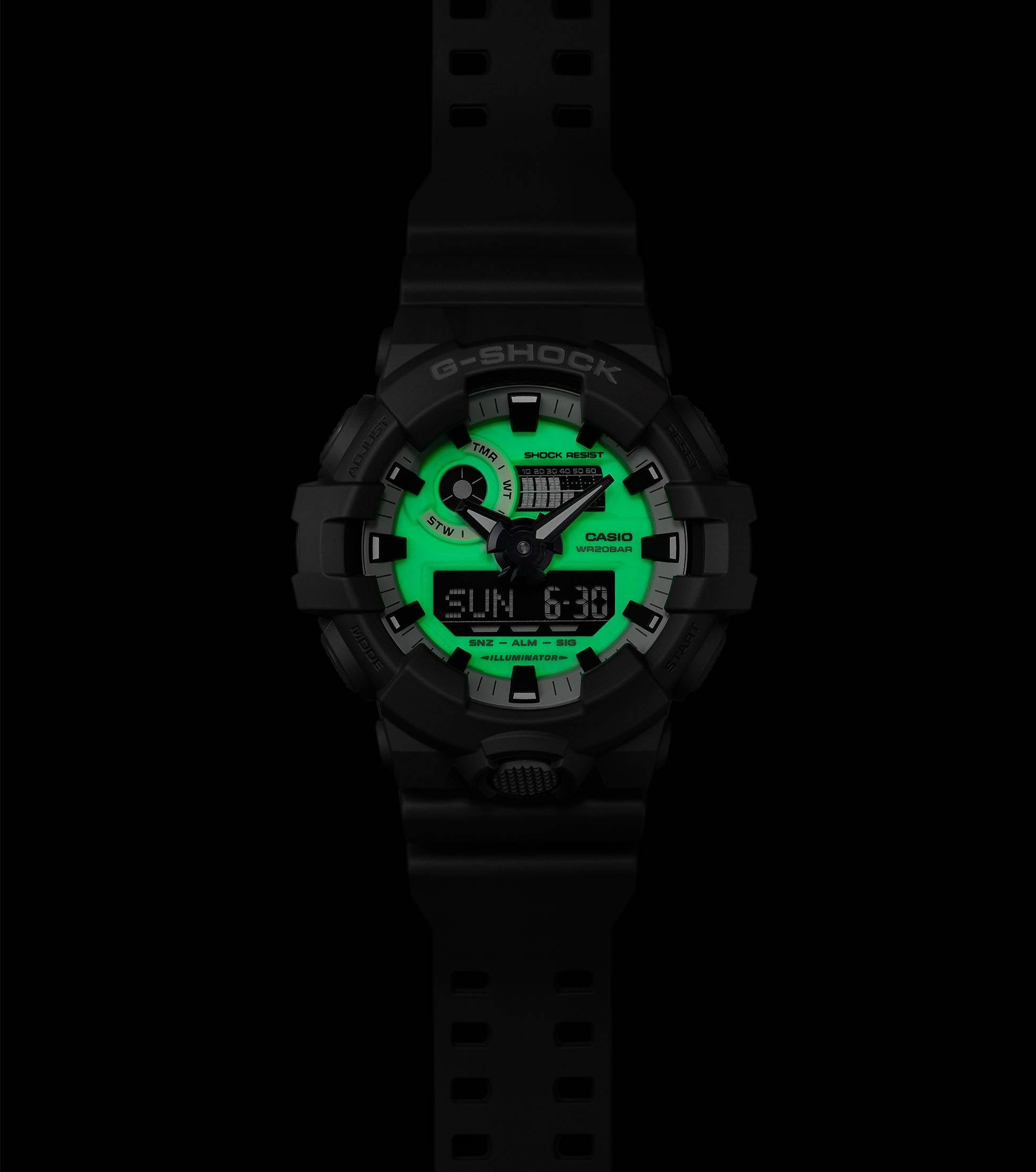 Porta alla luce i tuoi lati nascosti con la serie G-SHOCK “Hidden Glow” che si illumina al buio. Tutti i modelli possiedono delle parti luminescenti all’interno del quadrante che rivelano un bagliore verde in situazioni di scarsa luminosità, accentuando il design distintivo di ogni modello.Inoltre, i principali componenti dell’orologio sono realizzati in resina bio-based, prodotta utilizzando risorse organiche rinnovabili.Il risultato è quello di un orologio monocromatico sui toni del grigio con un design fluorescente e accattivante.