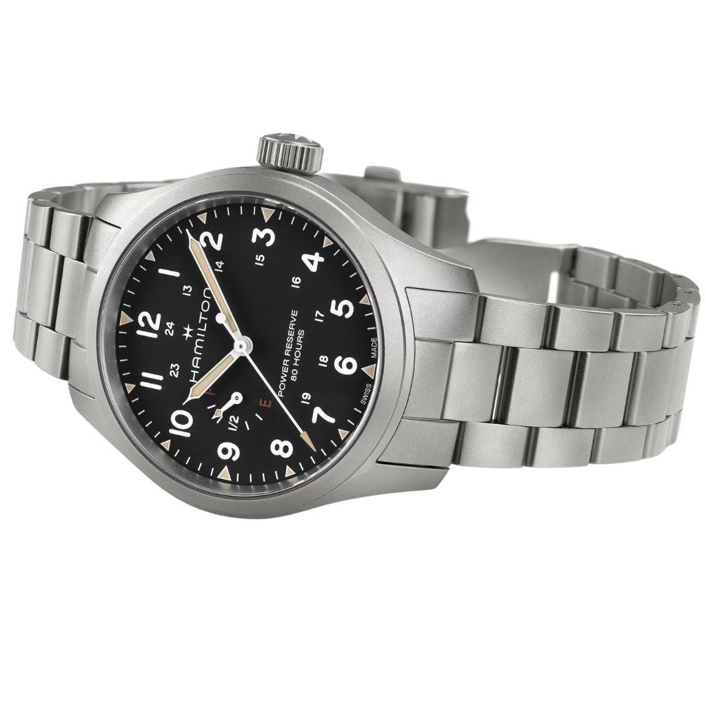Hamilton Khaki Field Mechanical Power Reserve H69509130L’Hamilton Power Reserve H69509130 è un orologio che interpreta in chiave contemporanea lo spirito militare della storica collezione Hamilton Khaki. La cassa in acciaio da 40 mm con finitura sabbiata sottolinea il carattere robusto e funzionale, mentre il quadrante nero opaco con indici e lancette luminescenti garantisce massima leggibilità in ogni condizione. A rendere unico questo modello è l’indicatore della riserva di carica a ore 9, che mostra con immediatezza l’autonomia residua del calibro meccanico a carica manuale H-23. Il movimento, dotato di spirale Nivachron per una maggiore resistenza ai campi magnetici, assicura fino a 80 ore di marcia continua, un risultato eccezionale per un segnatempo manuale. Protetto da vetro zaffiro e impermeabile fino a 100 metri, l’Hamilton H69509130 abbina lo stile autentico dei field watch a prestazioni moderne, diventando una scelta ideale per chi cerca un orologio dal fascino militare senza rinunciare a solidità e precisione.
