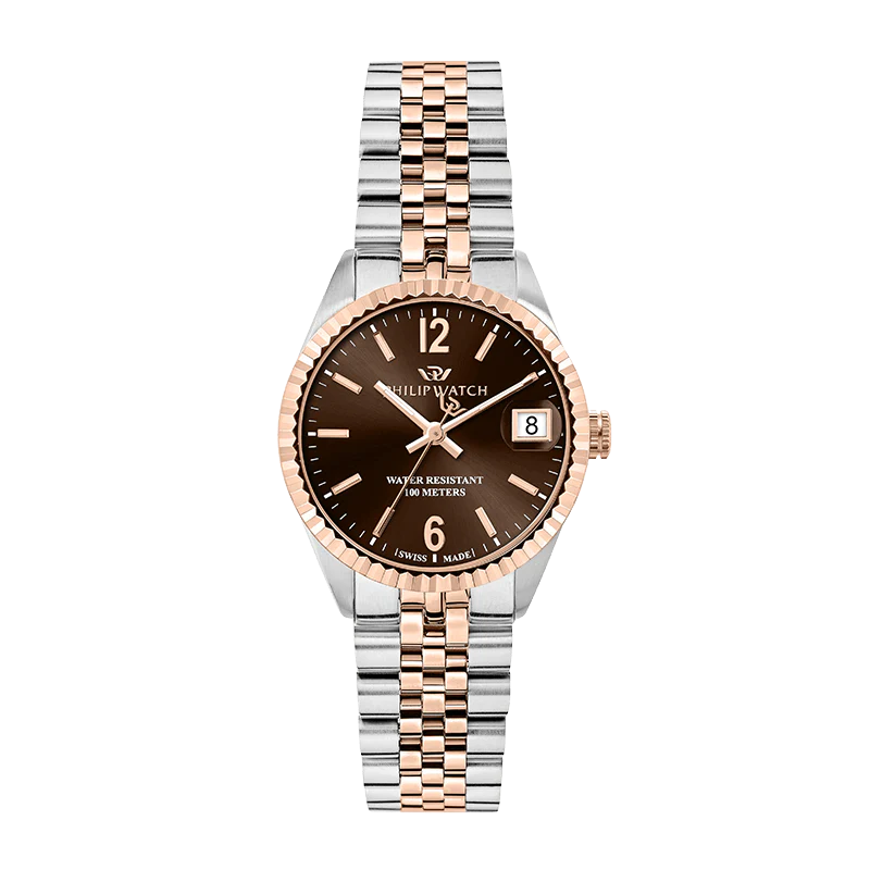 orologio donna philip watch, R8253597660, collezione caribe urban, movimento al quarzo, solo tempo, cassa in acciaio 31mm, quadrante marrone con datario a bolla, vetro zaffiro, fondello e corona a vite, bracciale in acciaio, resistenza all'acqua 10atm