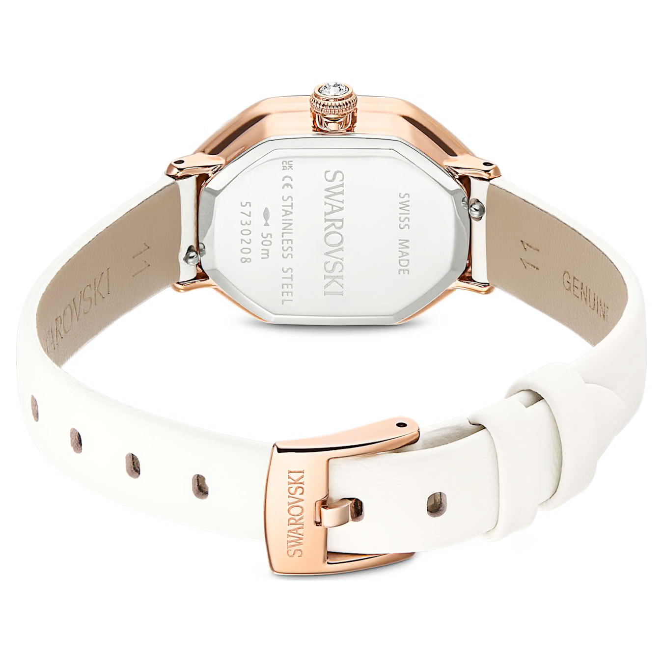 Ispirato all’intramontabile eleganza della famiglia Dextera, l’orologio 18 x 23 mm è realizzato in modo unico nell’iconica forma ottagonale di Swarovski. Realizzato in acciaio inossidabile con una finitura in tonalità oro rosa, il design presenta una lunetta con 46 cristalli montati a pavé e un ulteriore cristallo incastonato all’interno della corona. Il quadrante con motivo sunray include anche delicati indici in cristallo, oltre a sottili lancette e un logo cigno a ore 12. A completare questa radiosa creazione, l’orologio è corredato da un cinturino in pelle bianca. Questo orologio Swiss Made è resistente all’acqua fino a 50 metri.