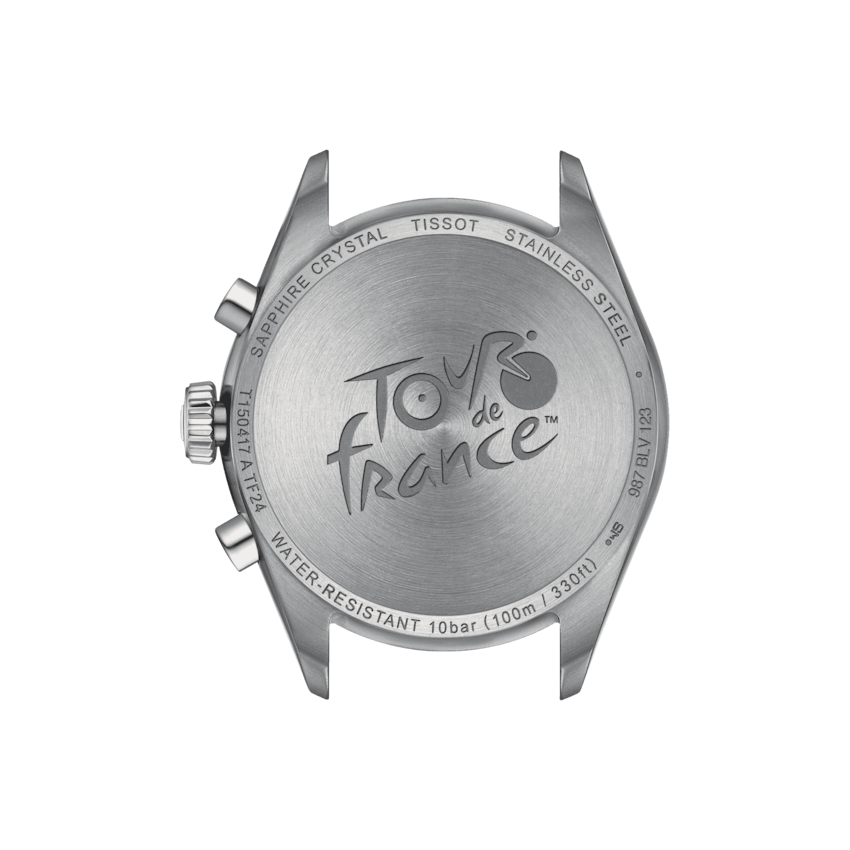 Questa edizione speciale di un best sellers Tissot vanta una cassa realizzata in acciaio inossidabile 316L, durevole e resistente, garantendo che l'orologio mantenga il suo fascino anche in condizioni faticose. Il quadrante presenta un tema nero con venature asfalto, che riflette la strada sotto le ruote dei ciclisti. Il design incorpora una lancetta dei secondi nell'iconico giallo del Tour de France, abilmente modellata come una bicicletta. Il disco nero della finestra della data aggiunge un tocco elegante, in linea con l'estetica generale dell'orologio. Il movimento crono al quarzo G10.212 all'interno offre massima precisione , completata da resistenza all'acqua fino a 10 bar (100 metri/330 piedi). La visibilità in condizioni di scarsa illuminazione è garantita dal rivestimento Super-LumiNova® sul quadrante e sugli indici. Il fondello di questo modello Grand Tour PR100 è inciso con il logo del Tour de France. La versatilità del PR100 è esaltata da un bracciale in metallo a tre file con fibbia a farfalla. Viene offerto in omaggio un secondo cinturino offerto nero che utilizza la trama delle manopole del manubrio della bicicletta e presenta i colori del Tour de France.