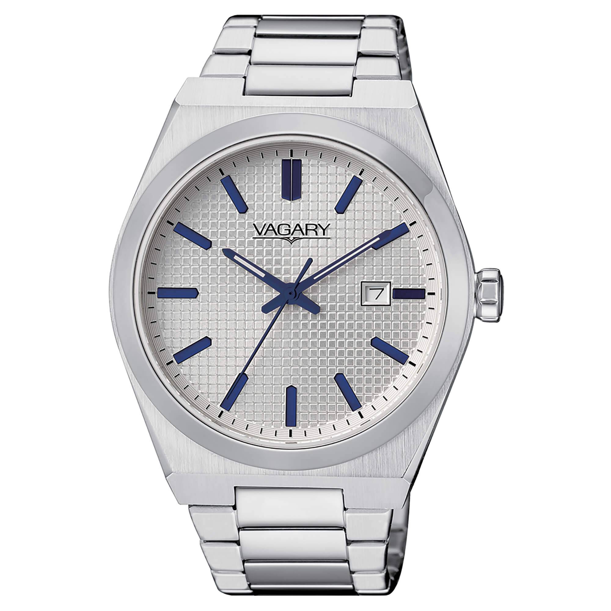 Orologio solo tempo da uomo di Vagary della collezione Timeless. Ha: cassa in acciaio di diametro 40MM; quadrante silver con indici applicati; bracciale in acciaio integrato con chiusura a pulsante; resistenza all'acqua di 5 ATM; movimento al quarzo; funzione datario; vetro minerale
