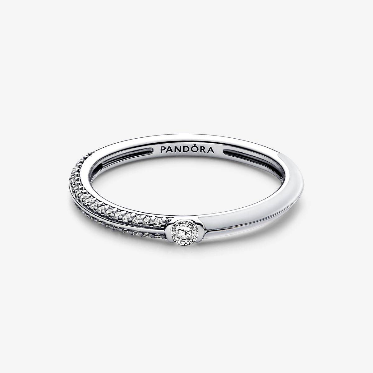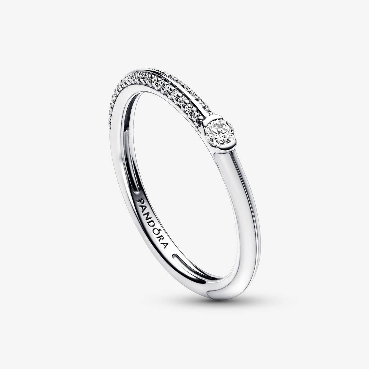 Una pietra di zirconia cubica incolore taglio rotondo è posizionata tra una fila di pavé scintillanti e lo smalto bianco applicato a mano che decorano i due terzi della fascia realizzata in Argento Sterling 925. Gioca con i contrasti e abbinalo ad altri anelli Pandora ME per creare una combinazione personalizzata.