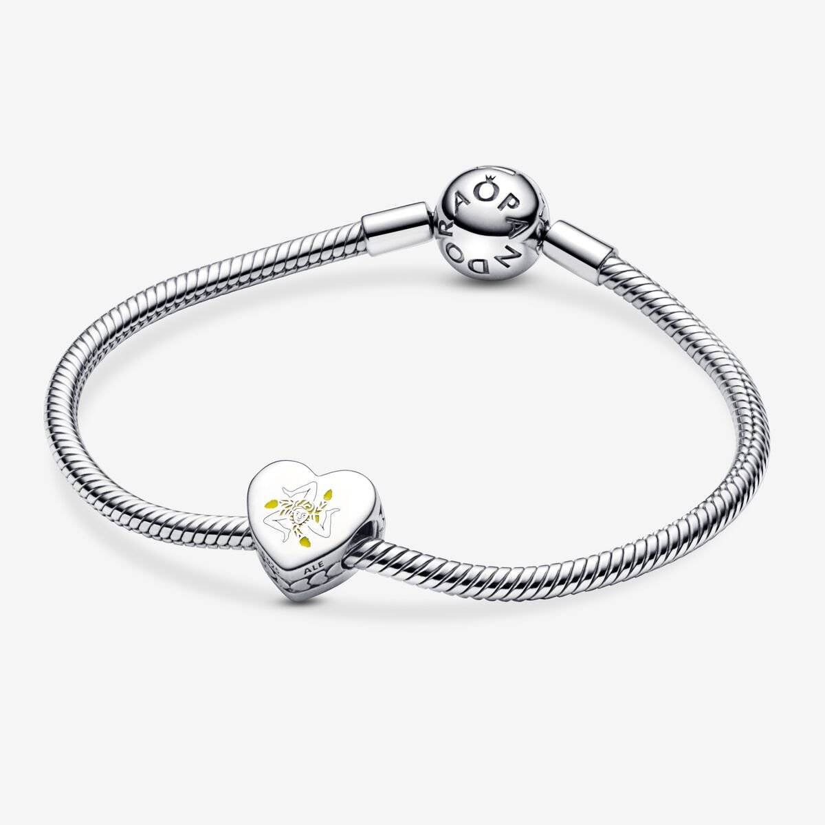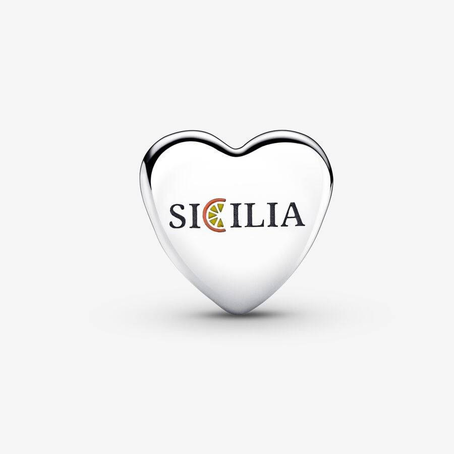 Questo charm ispirato alla Sicilia è realizzato in argento sterling 925, presenta cuori in rilievo attorno al bordo, da un lato il simbolo della 'Trinacria', che raffigura una donna a tre gambe simbolo della Sicilia. Dall'altro lato è incisa la parola SICILIA - la C è creata utilizzando una fetta d'arancia per rappresentare la Sagra dell'Arancia Rossa: una festa siciliana che celebra le arance rosse, considerate l'oro rosso dell'isola.