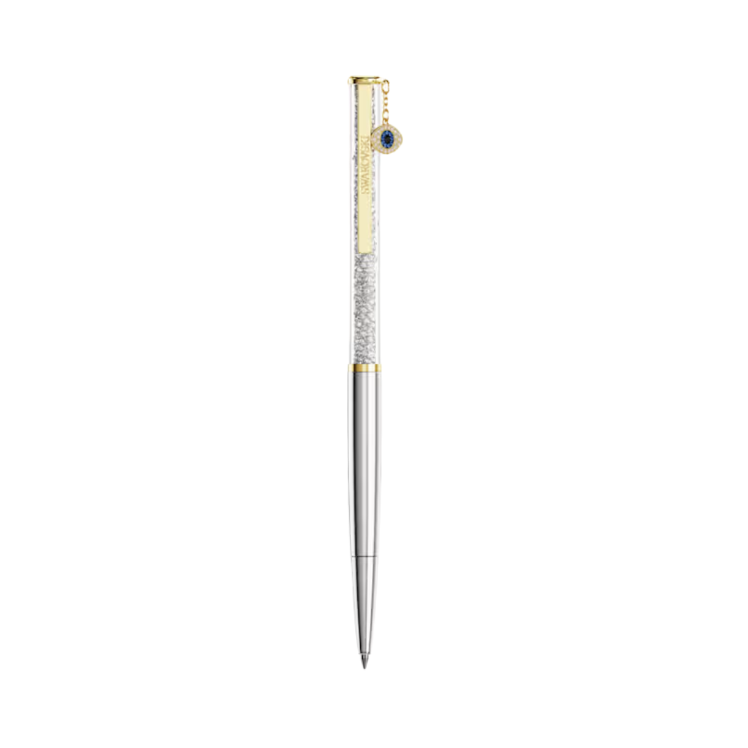 Questa sottile penna a sfera è un accessorio senza tempo per una creatività infinita. Il design sottile è impreziosito da circa 400 cristalli Cry, visibili attraverso la lunga finestrella trasparente. Per un look ultra-lussuoso, è stato utilizzato un mix di finiture in tonalità oro e cromate, mentre il charm a forma di occhio di Allah aggiunge un tocco misterioso e significativo. Un regalo perfetto per te o per chiunque ami esprimersi con le parole. Le ricariche di inchiostro nero e blu sono disponibili per l’acquisto negli Swarovski store.