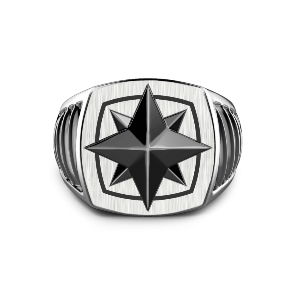 Anello in Argento 925 con finitura satinata. Rosa dei venti in ceramica nera incastonata sulla parte superioire. I lati sono caratterizzati da elementi di design geometrici in colore nero a contrasto e rosa dei venti incisa.